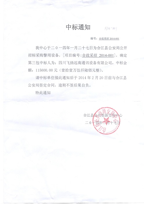 14年1月中標合江公安局警用設備采購項目(11.56萬) 作者:管理員 來源:飛揚遠南 瀏覽:1017次 更新:2014-5-28 |