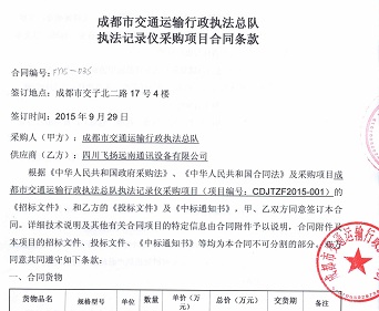 15年9月與成都交通運輸行政執法總隊簽訂執法記錄儀采購項目 作者:管理員 來源:飛揚遠南 瀏覽:1383次 更新:2015-11-6 |